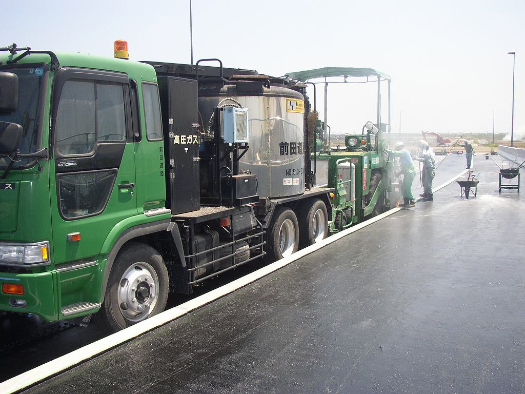 路盤を均して、乳剤を撒いて、舗装です