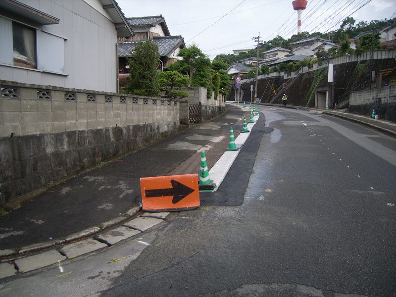 左の車道と歩道の境界の管渠型側溝を布設している間に