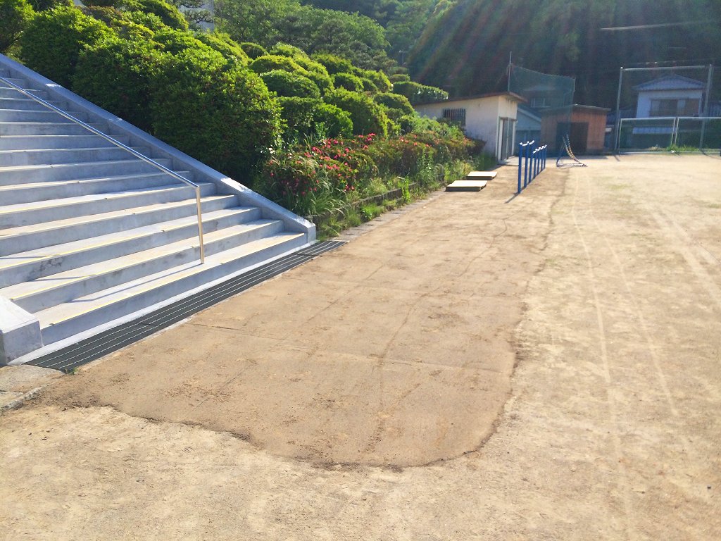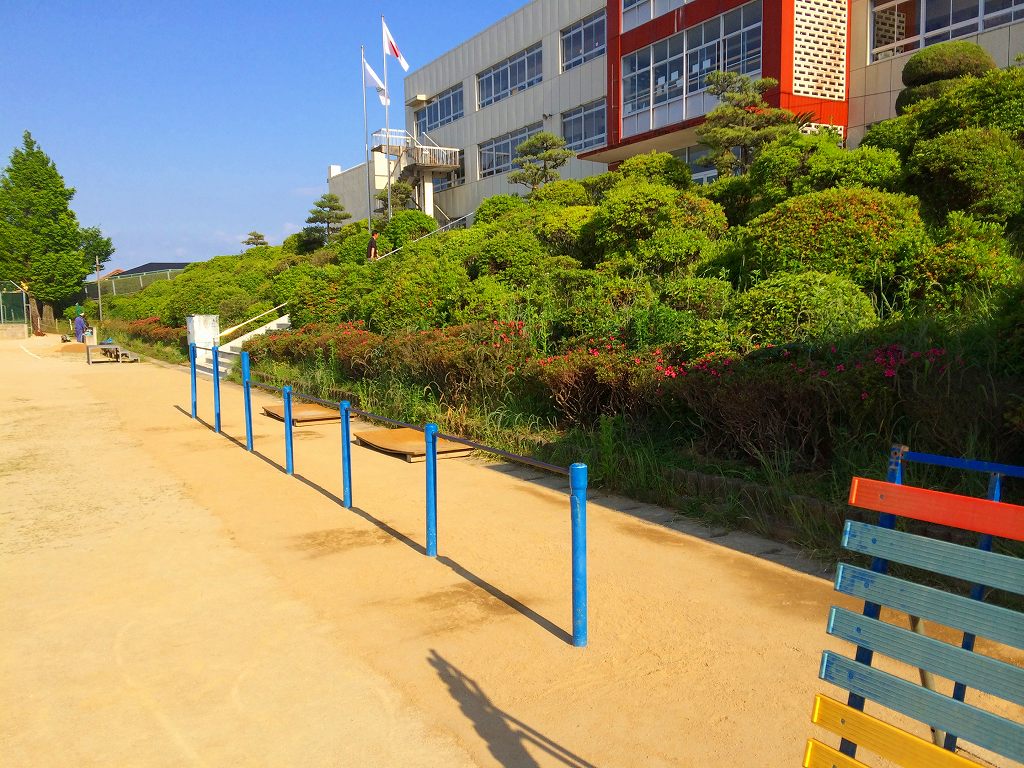 正面玄関前の階段下から鉄棒のグランド