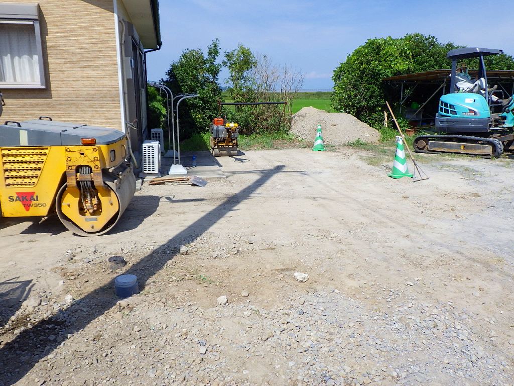 次は転圧して基礎砕石を敷均しまた転圧し
